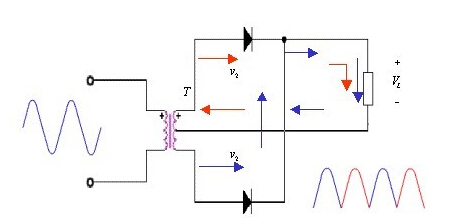 全波整流電路:利用副邊有中心抽頭的變壓器和兩個二極管構成如下圖所示的全波整流電路,從圖中可見,正負半周都有電流流過負載,提高了整流效率。