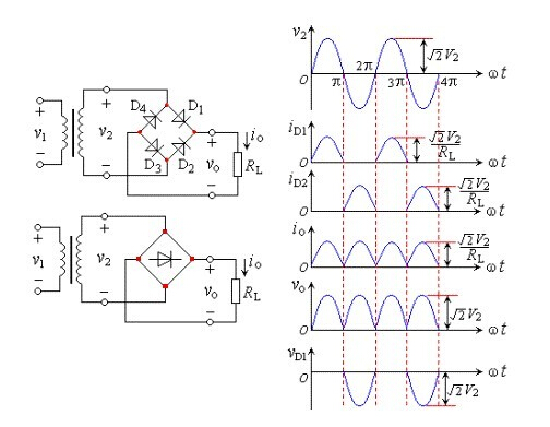 單相橋式整流電路是最基本的將交流轉換為直流的電路,在分析整流電路工作原理時,整流電路中的二極管具有單向導電性。當正半周時,二極管D1、D3導通,在負載電阻上得到正弦波的正半周。當負半周時,二極管D2、D4導通,在負載電阻上得到正弦波的負半周。在負載電阻上正、負半周經過合成,得到的是同一個方向的單向脈動電壓。